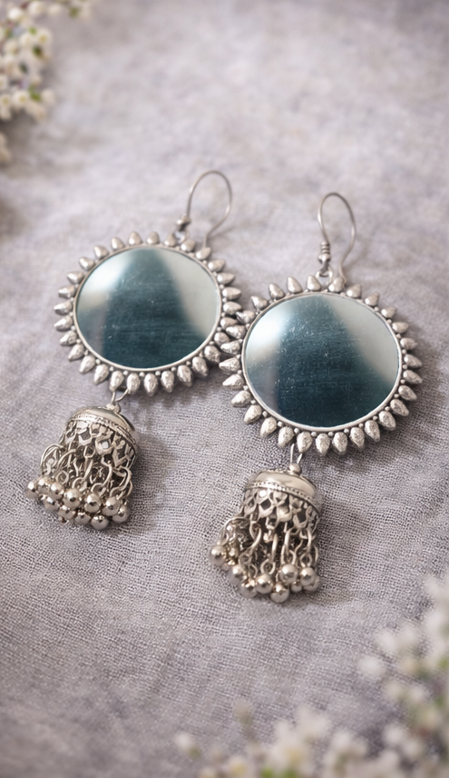 Make a powerful ethnic style statement with this Oxidised Silver Mirror Work Earrings Combo Set, featuring two stunning handcrafted designs. One pair showcases bold round mirror studs paired with jhumka-style drops, while the other features elegant square mirror drops with delicate hanging bead detailing.